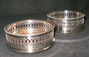 Tre vinbakker i pletsølv. Et par "silver plated" diameter 12 cm og en enkelt bakke i plet 16,5 cm.