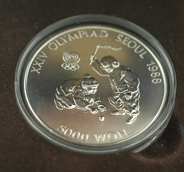 Syd Korea, 5000 won proofmønt i sterlingsølv, præget i anledning af de Olympiske lege i Seoul 1988.
