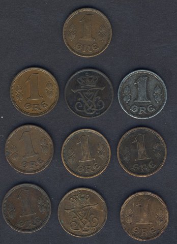 Samling 1 øre, Fr. VIII + Chr. X. (10 stk.)