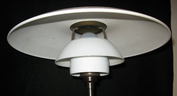 Poul Henningsen (1894-1967), PH bordlampe af bemalede metaldele, bakelitfatningshus, monteret med 4/2¾ skærme i enkeltlags opalglas, gennemgående afbryder.