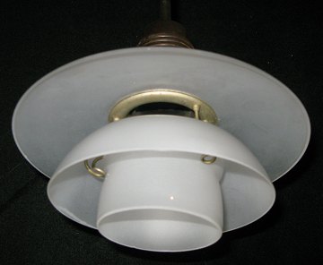 Poul Henningsen (1894-1967), PH 5-armet bombardementskrone, bakelitfatningshuse og patinerede metaldele, monteret med 2/2 matglas skærme. Produceret hos Louis Poulsen i 30'erne.