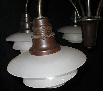 Poul Henningsen (1894-1967), PH 5-armet bombardementskrone, bakelitfatningshuse og patinerede metaldele, monteret med 2/2 matglas skærme. Produceret hos Louis Poulsen i 30'erne.
