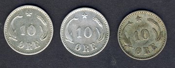 Chr. IX, 10 øre 1897, 1894 og 1903.