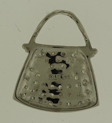 Diamantvedhæng i form af taske af 9 kt rhodineret guld prydet med talrige runde, facetterede diamanter på i alt ca. 0.30 ct.