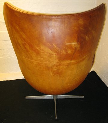 Arne Jacobsen (1902-1971), Ægget med betræk af originalt cognac farvet patineret skind. Opsat på profileret stamme og firpasfod af aluminium, drejefunktion, skallen formet af fiberglasforstærket kunststof med skumpolstring.