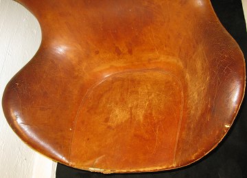 Stolen fremstår med enkelte huller i skindet (se fotos) og en smule røglugt. Hynde mangler.