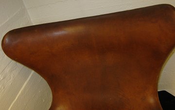 Arne Jacobsen (1902-1971), Ægget med betræk af originalt cognac farvet patineret skind. Opsat på profileret stamme og firpasfod af aluminium, drejefunktion, skallen formet af fiberglasforstærket kunststof med skumpolstring.