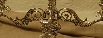 Et par kandelabre af sølv, hver med fire lysarme rigt dekoreret med bladværk og ornamentik. Portugal. 20. årh.