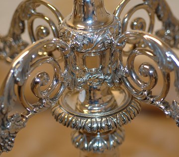 Et par kandelabre af sølv, hver med fire lysarme rigt dekoreret med bladværk og ornamentik. Portugal. 20. årh.