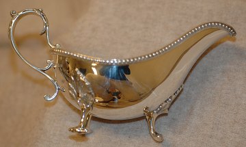 Et par saucenæb i sølv, prydet m. bladværk og løvefødder. Stemplet Sheffield 1930.