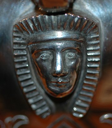 K. Tømmerup, historicistisk kaffekande af sølv, prydet m. egyptisk dødsmaske og stilliseret bladværk. Hankens top er formet som en mytologisk grif. Stemplet "KT" 1887.