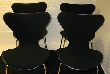 Arne Jacobsen (1902-1971), 4 syverstole, model 3107, sortlakeret skal, forsiden betrukket med sort uld, forkromede ben. Fremstillet hos Fritz Hansen