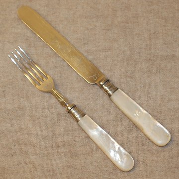Mappin & Webb, fiskebestik i plet m. skafter af perlemor, prydet m. ciseleringer i form af vinranker og liggende i æske af ædeltræ m. indlagt messing.