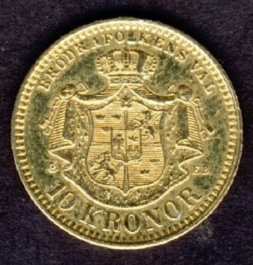 Sverige, 10 krone 1876, GULD.