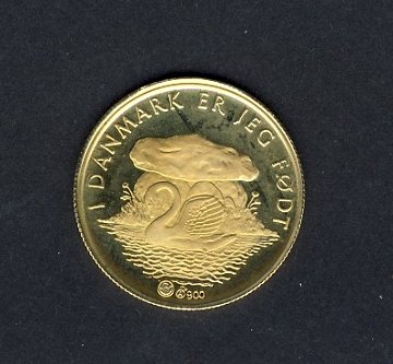 Lille medaille af guld 21,6 kt. Slået til minde om Hans Christian Andersen's 100 års dødsdag. 3,5 gram