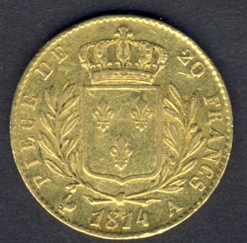 Frankrig, Louis XVIII, 20 francs GULD 1814A, KM 706,1
