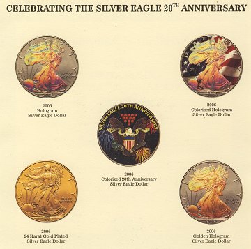 5 stk. Silver Eagle, 1 dollar SØLV 2006. Mønterne er efterbehandlet på forskellig måde, farvebelagt, pålagt hologram, delvis forgyldt m.m.