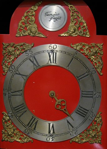 Standur af bemalet træ, urværk af nyere dato, skive med romertal. H. 223, B. 46.