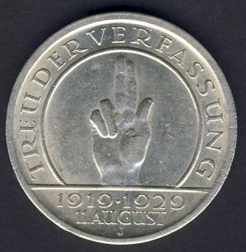 5 Reichsmark, 1929, 10 års jubilæum for Weimarforfatningen