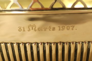 Jardinere af gennembrudt SØLV m. glasindsats, stående på fødder m. hove. Inskription og initialer på siderne. Stemplet "PH 830S". Fremstår m. en enkelt bule på den ene hank.
