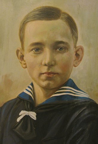 Ubekendt maler, 20. årh.s første halvdel: Portræt af en ung dreng i matrostøj. Signeret. Betegnet på bagsiden: "Portræt af Stig Knudsen". Olie på lærred, 70x55.