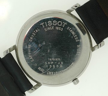 Tissot, herrearmbåndsur m. kasse af stål, safirglas, læderrem, datoangivelse i 3" position. Ø. 34 mm.