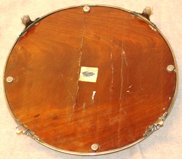Dansk bordspejl af SØLV, prydet m. bladværk og fødder, udfyldt og m. træpladebund. Utydeligt mesterstempel, 1870. Ø. 38 cm.