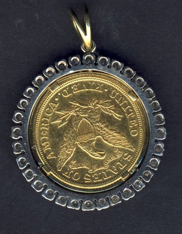 5 dollar GULD 1907 - indsat i vedhæng af hvidguld prydet med 32 brillanter af god kvalitet, ialt ca. 2 ct.