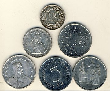 Schweiz, 4 diverse 5 franken samt 2 frank og 1 frank