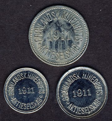 Aktieselskabet Grønlandsk Minedrift udvandt bl.a. kobber i Julianehåb området. Firmaet fik fremstillet disse private betalingstegn hos L. Chr. Lauer i Nürnberg.