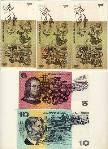 Australien, 10 dollar, 5 dollar samt 3 stk 1 dollar - ucirkulerede