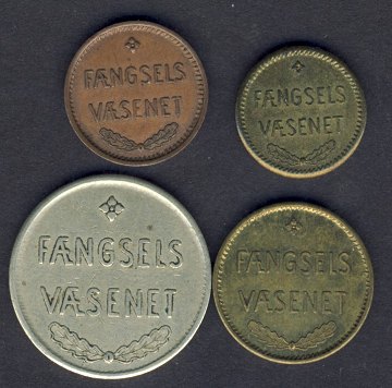 Poletter fra Fængselsvæsenet 1, 2, 10 og 100 øre