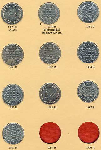 Møntalbum m. danske 10 kr 1979-1988 - samling bestående af 10 mønter.