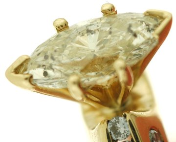 Diamantring udført i 14 kt GULD m. én marquisesleben diamant på ca. 0,90 ct, flankeret af talrige mindre brillantslebne diamanter på ca. 0,40 ct. Indvendig stemplet "JH 585". Str. 54.