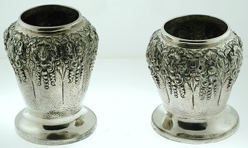 Vaserne er prydet m. blomsterornamentik og bægrene m. stilliseret bladværk. Sandsynligvis fra Burma. Stemplet henholdsvis "800MD" og "DWH 800". H. 9, 8, 7,5 og 7,5 cm.