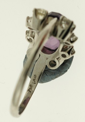 Diamantring af 18 kt GULD, prydet med 8 brillantslebne diamanter på samlet ca. 0.70 ct, samt oval facetsleben ametyst. Str. 56 vægt: 4,5 gr.