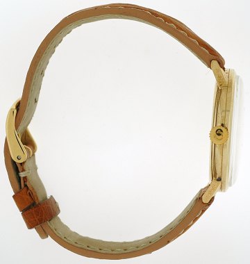 Omega herrearmsbåndsur m. kasse af 14 kt. GULD, sekundviser, plexiglas og lys læderrem.