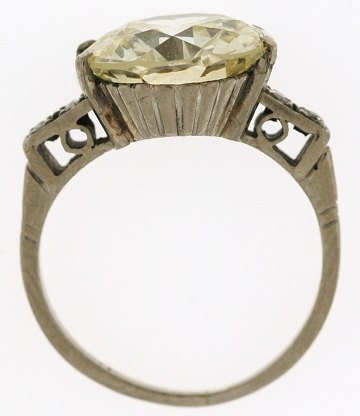 Diamantring af platin/hvidguld?, prydet m. en gammeldagsslebet diamant på ca. 5,70 ct vvs2, flankeret af 4 rosenslebne diamanter på ialt 0,10 ct.