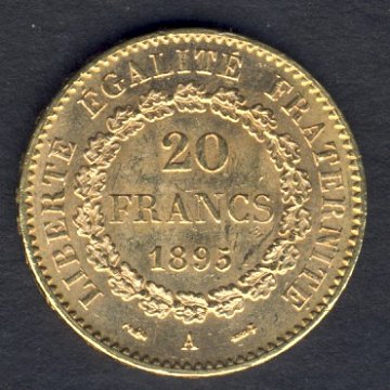 Guldmønt præget m. laurbærkrans på forsiden og bevinget engel på piedestal på bagsiden.