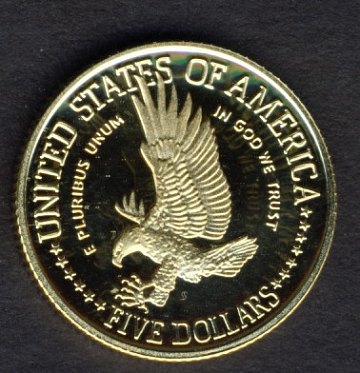 Denne erindringsmønt i guld er præget for at markere Frihedsstatuens 100 års jubilæum og er Amerikas første femdollar erindringsmønt.