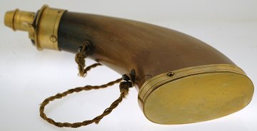 Krop af kohorn, svajet form, med bund af messing. Fyldestuds, ligeledes af messing, m. variabel ladningsstørrelse. Lukkemekanisme af messing med stålfjeder. I siden ringe m. bæresnor. H. 16 cm.