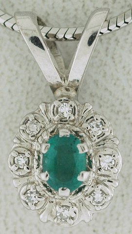 Diamantvedhæng af 14 kt. hvidguld, prydet m. en ovalsleben smaragd på ca. 0,20 ct, hvilken er indkranset af 8 brillantslebne diamanter på ialt ca. 0,04 ct. Stemplet "MLF 585".