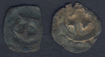 Dansk middelalder møntsæt, bestående af Erik Menved, penning ca. 1286-1319 og Christoffer II, penning ca. 1319-1332. Begge af sølv holdig kobber, ca. diam.: 18 mm.