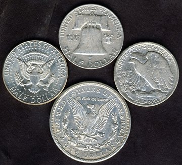 4 stk. amerikanske mønter, bestående af dollar 1921, half dollar 1934, 1957 og 1964.