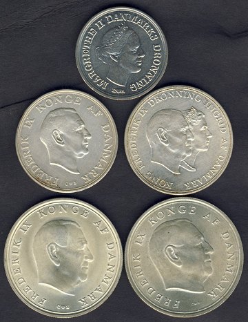5 stk. jubilæumsmønter, bestående af: 2 kr 1958, 5 kr 1960, samt 10 kr 1967, 1968, 1986.