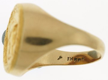 Doktorring, udført i 14 kt GULD. Indvendig stemplet m. krone og FH for Kgl. Hofleverandør Frantz Hingelberg, Århus. Str. 66. Vægt 16 gr