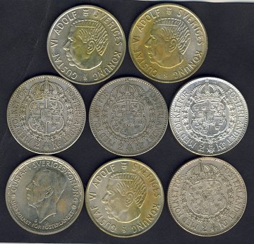 Samling bestående af: 2 kr 1924, 1926, 1936, 1939, 1950, 1953, 1954 og 1955.