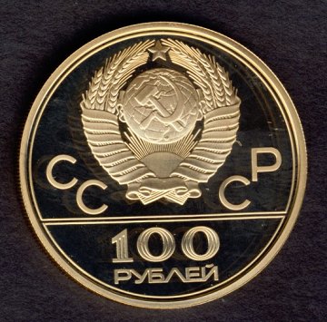 100 rubler GULD 1979 (M), præget i forbindelse med OL i Moskva 1980. Afbilledet på reversen Velodrome bygningen. Indeholder præcis ½ ounce finguld. Proof kvalitet.