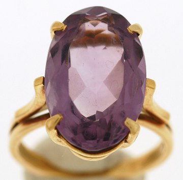 Fornem 18 kt. guldring, prydet m. stor facetsleben ametyst. Str. 53.