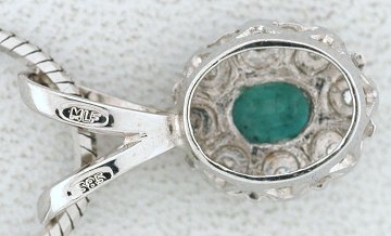 Diamantvedhæng af 14 kt. hvidguld, prydet m. en ovalsleben smaragd på ca. 0,20 ct, hvilken er indkranset af 8 brillantslebne diamanter på ialt ca. 0,04 ct. Stemplet "MLF 585".
